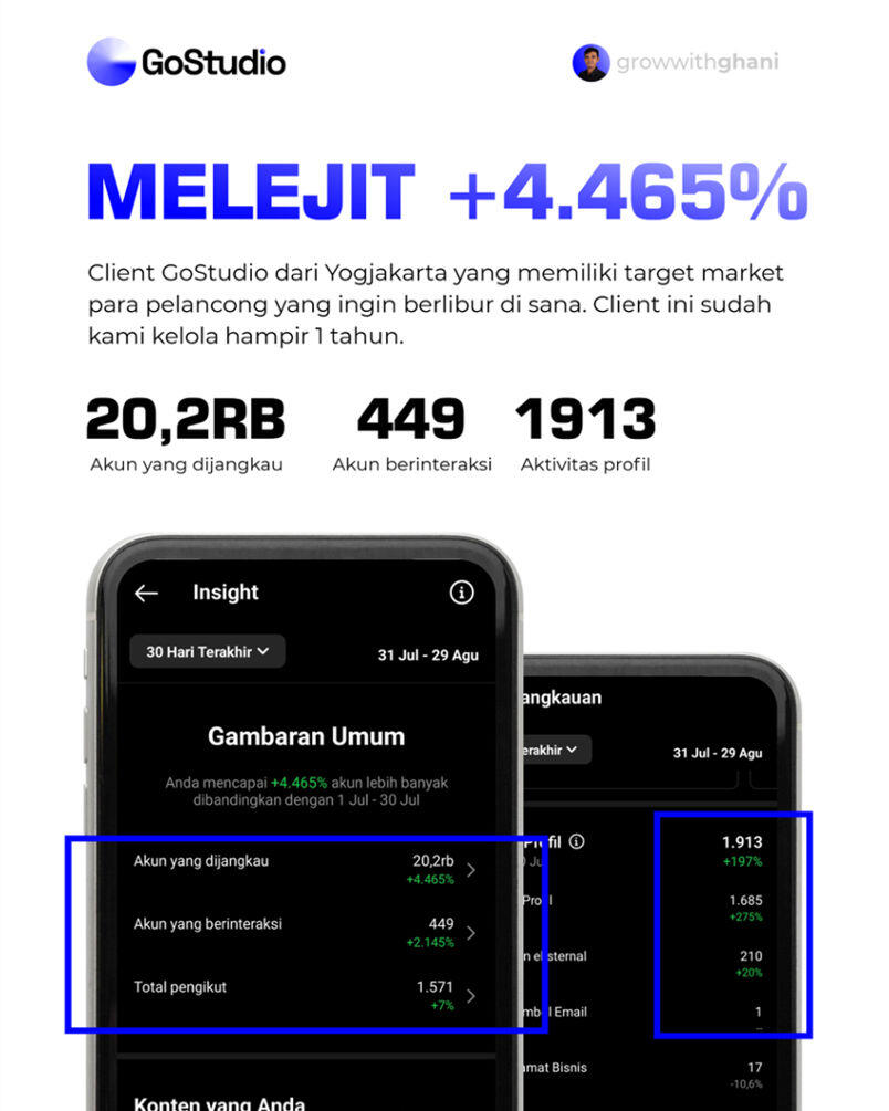 Portofolio desain dan video reels dari 40++ akun instagram yang sudah GoStudio kelola.